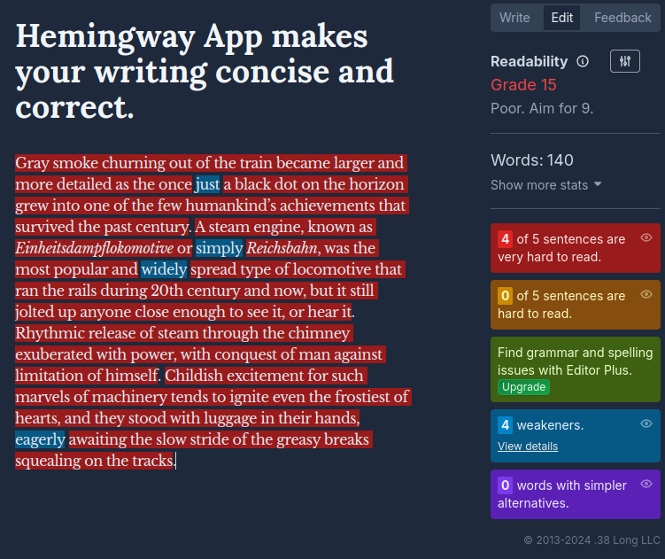 Also, "Hemingway App" is some AI stuff isn't it? I barely trust an "AI" (machine learning) to do my spellchecking, let alone tell me what to do or how to do stuff, it can be beneficial for sure, but in a creative process?
